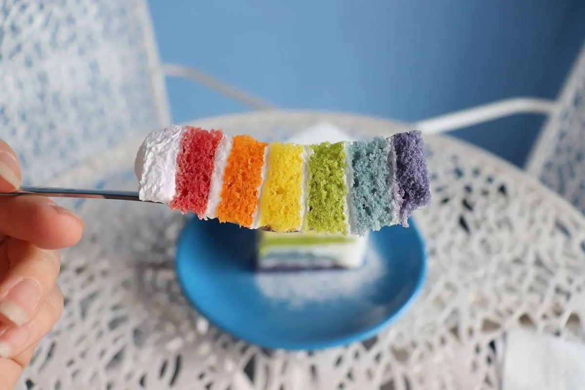 Regenbogenkuchen wird mit natürlicher Lebensmittelfarbe gefärbt, gemischt mit roten, orangefarbenen, gelben, grünen, blauen, violetten Kuchenschichten und weißer Creme. Er ist wegen seines bunten Aussehens und seines süßen Geschmacks beliebt. Regenbogenkuchen und Sky Blue-Getränke passen gut zusammen, nicht nur wegen ihres Aussehens, sondern sie sind auch köstlich, wenn man sie zusammen isst.