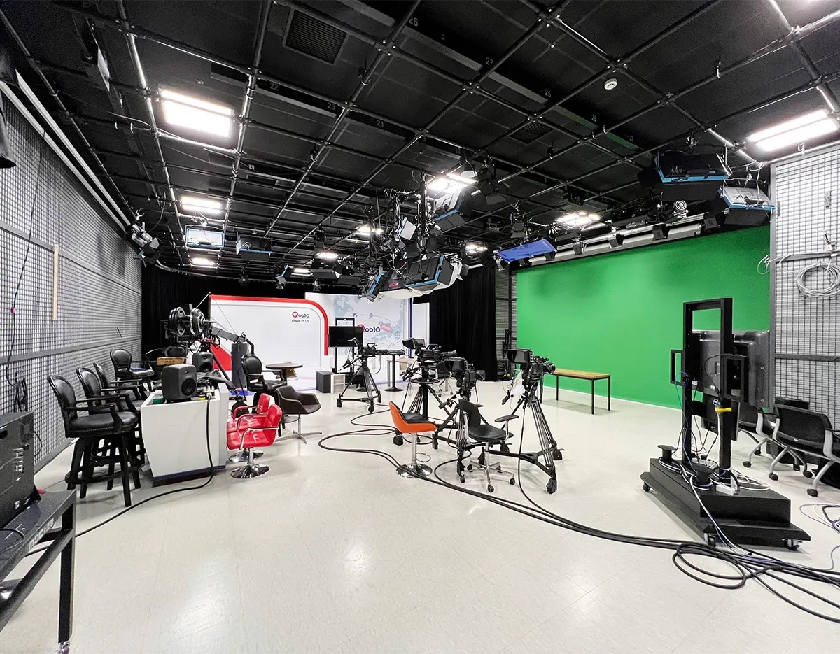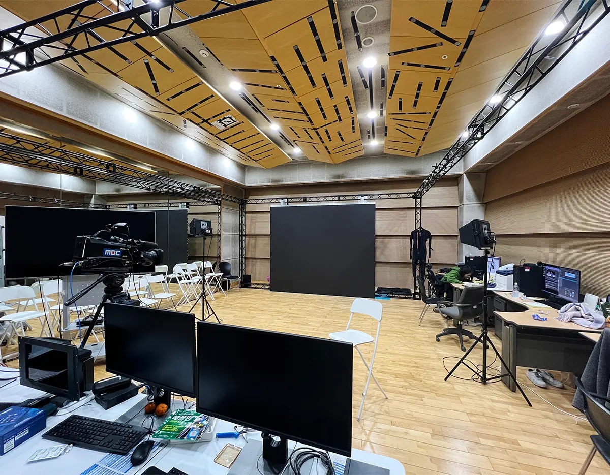 Dies ist ein hochmodernes Studio, das virtuelle Realität (VR), erweiterte Realität (AR) und Echtzeit-Grafiktechnologie integriert. Sie können einen besonderen Raum erleben, in dem Inhalte innerhalb eines virtuellen Hintergrunds erstellt werden, der sich wie ein echter Raum anfühlt.