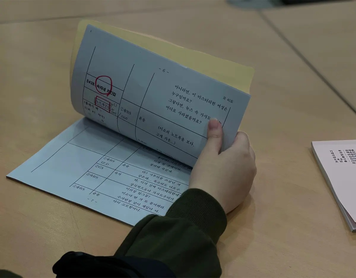 Dies ist der Raum, in dem die Besetzung eine Skriptlesung vor der Übertragung macht. Es ist ein wichtiger Schritt, bei dem sie die Dialoglieferung, das Timing und die Atmosphäre anpassen, um sich auf die eigentlichen Dreharbeiten vorzubereiten.