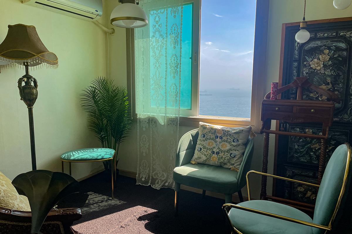 Just by looking at the seats, you can tell that it's different from a regular café, right? There are two rooms, both adorned in a retro concept, making it enjoyable to admire the props. You can order drinks and relax like you would in a café or wait here before your photoshoot. Through the window, you can catch a glimpse of the Yeongdo coastline, so I think taking photos from here would turn out really well.