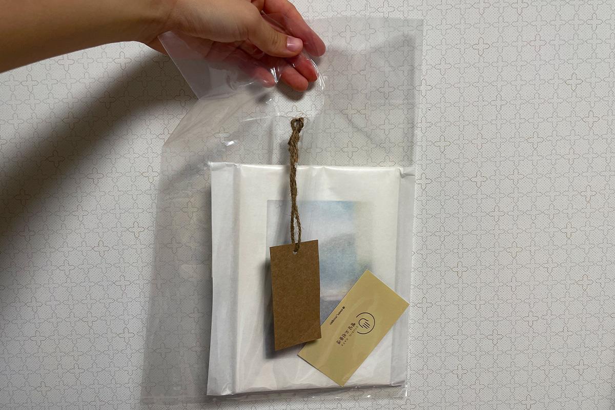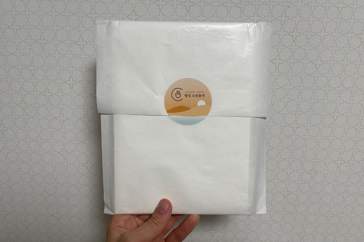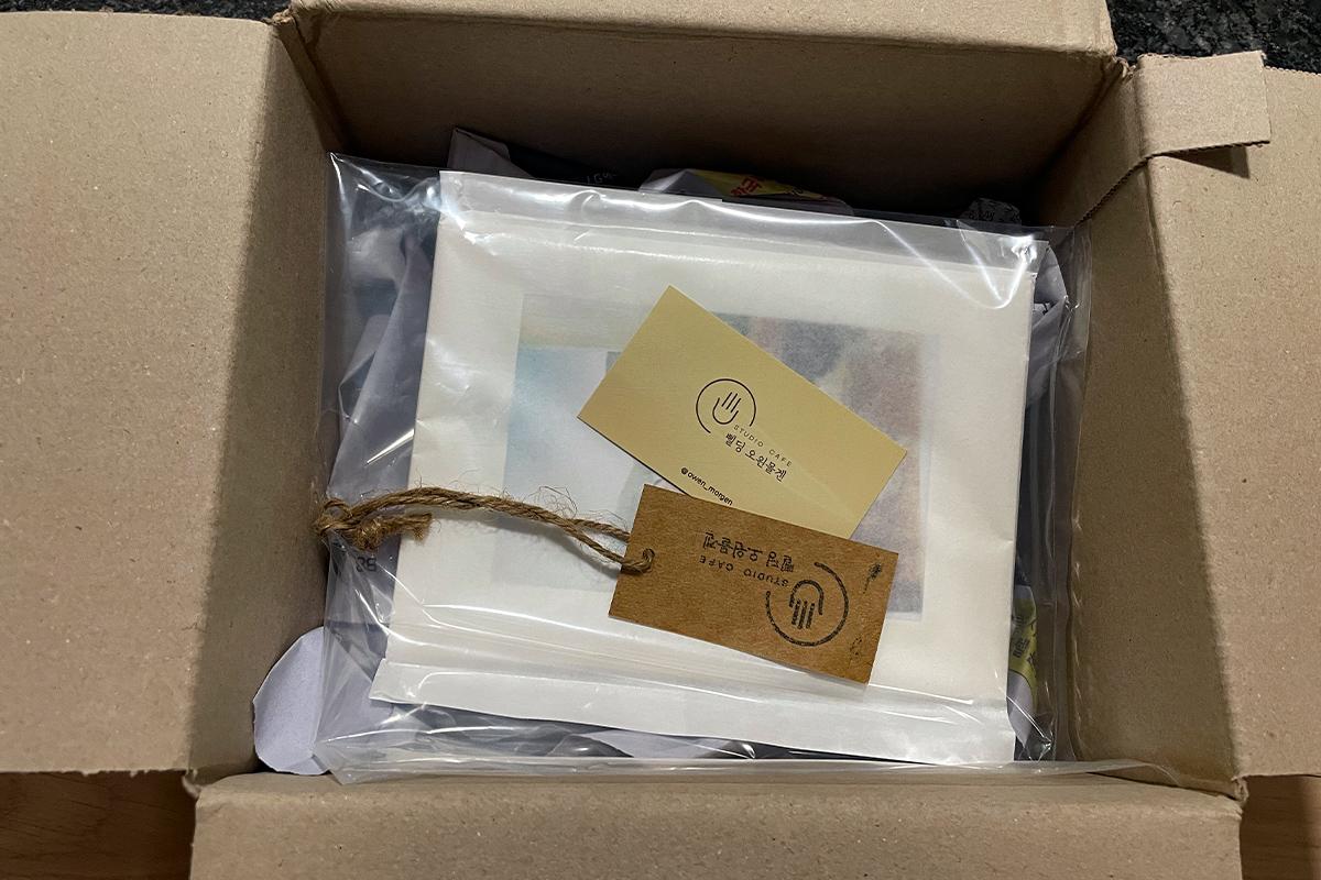 The photos are further protected with an additional layer of paper wrapping. They are sealed with a Building Owen Morgen sticker, and the sticker features a depiction of the Yeongdo coastline!