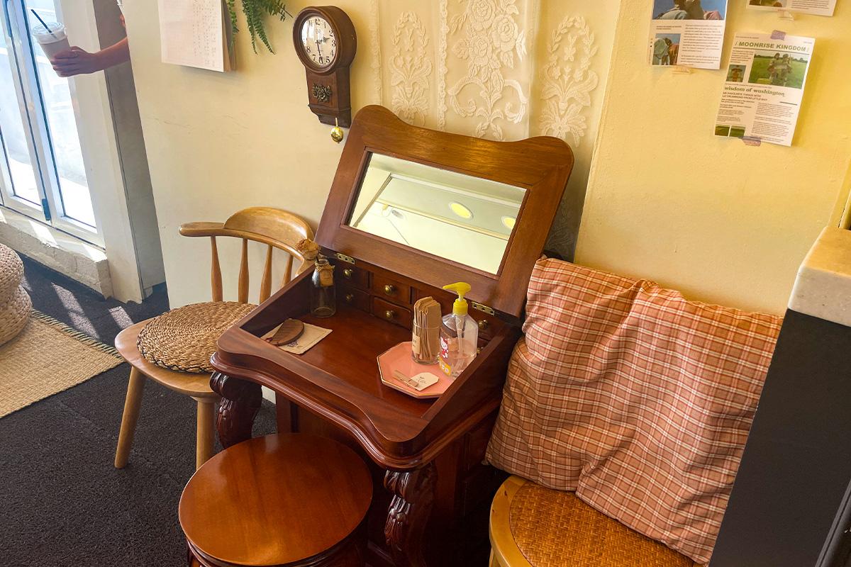 The first floor may not be spacious, but thanks to the props, products, and photographs, it's filled with charming and delightful sights to see. On the vanity table, there are hand sanitizers and combs, allowing you to get ready before the photoshoot.