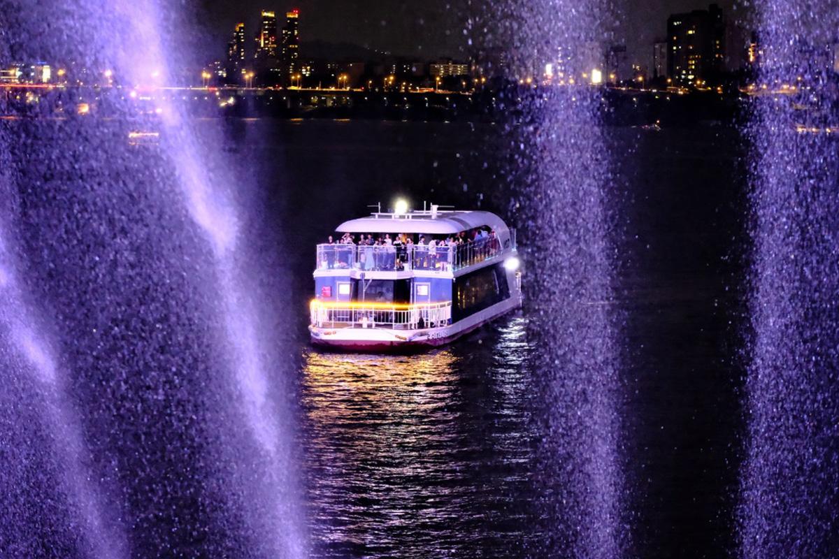 Experience a romantic Seoul night cruise with live music, close-up views of the Banpo Bridge Rainbow Fountain, and fireworks.