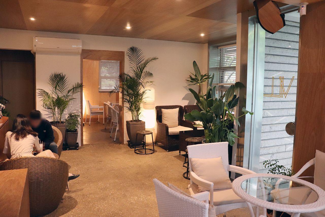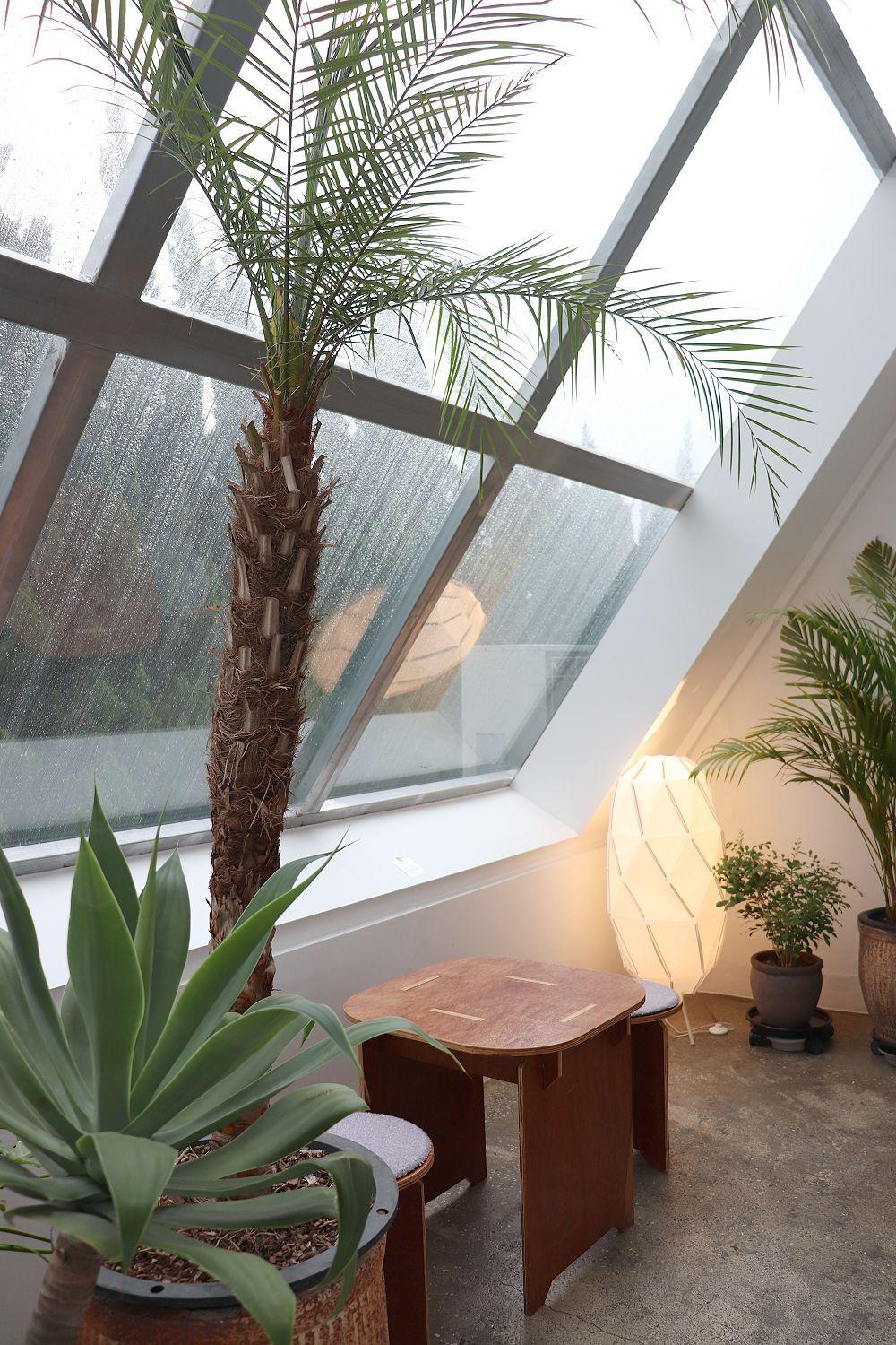 La décoration intérieure est très variée, mais sans être étrange ou décoordonnée. Travaillant dans un espace limité avec un style industriel minimal, l'intérieur de ce petit établissement à Daegu est l'un des rares qui soit comparable à ceux de Séoul. Les murs en béton apparent, les puits de lumière transparents, et une atmosphère détendue semi-intérieure attirent les invités à passer tout un après-midi dans cet espace confortable.