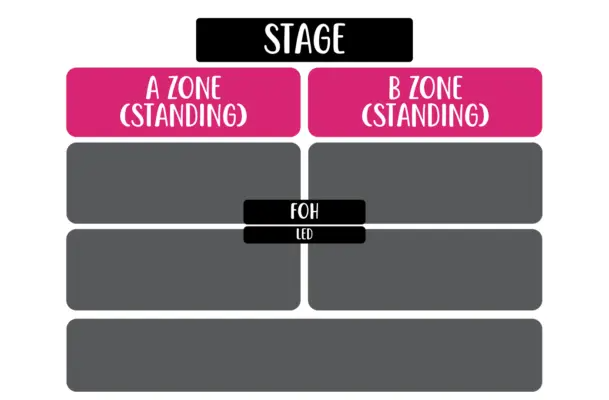- Beberapa nomor masuk area berdiri mungkin memiliki pandangan yang sebagian terhalang karena tata letak panggung, struktur, dan kamera. Harap dicatat bahwa pengembalian dana atau perubahan tiket karena pandangan terbatas pada hari pertunjukan tidak memungkinkan.