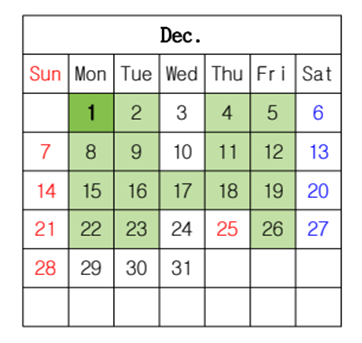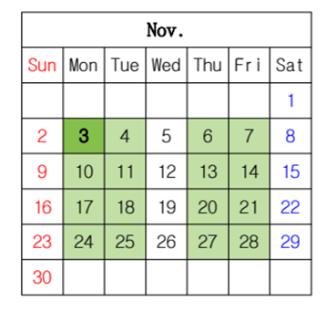 * Silakan lihat jadwal sekolah bahasa di bawah ini. Hari kelas disorot dengan warna hijau.