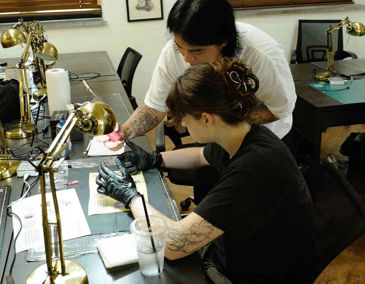 - Praktik langsung dengan menggambar desain dan mesin tato.