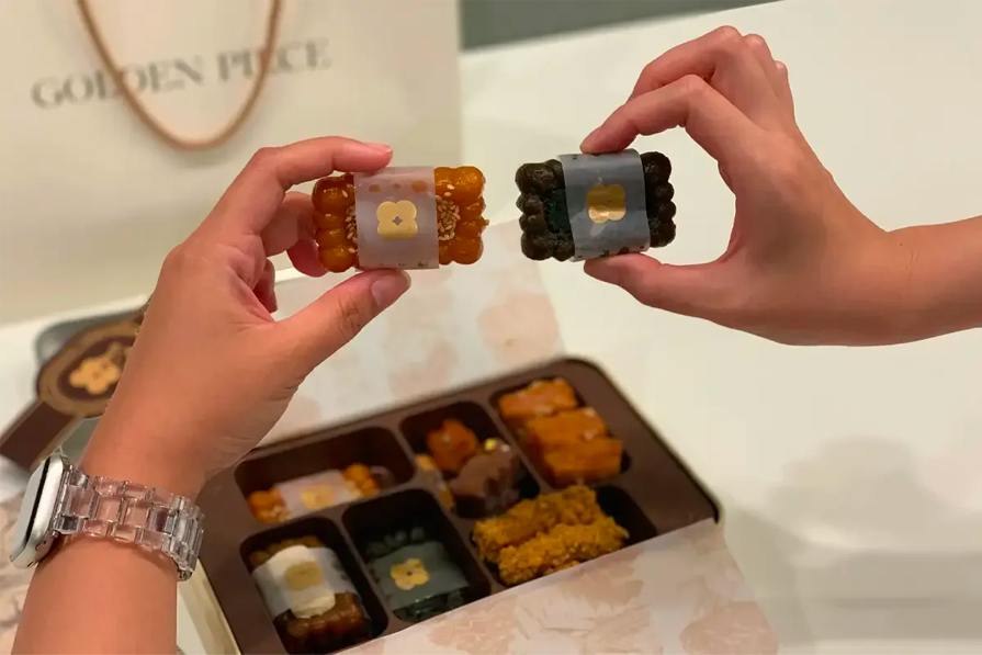 Durante l'apertura di un pop-up store in collaborazione tra G-DRAGON e NIKE, hanno distribuito dessert Golden Piece Yakgwa come piccoli regali a tutti i partecipanti, inclusi BTS RM e Jimin, LE SSERAFIM Kazuha e molti altri! Se vuoi provare i biscotti Yakgwa di alta qualità che le celebrità amano, devi dare un'occhiata a Golden Piece!