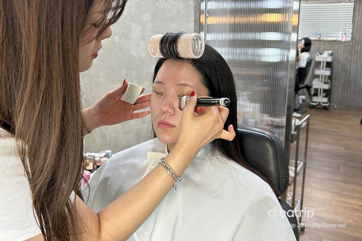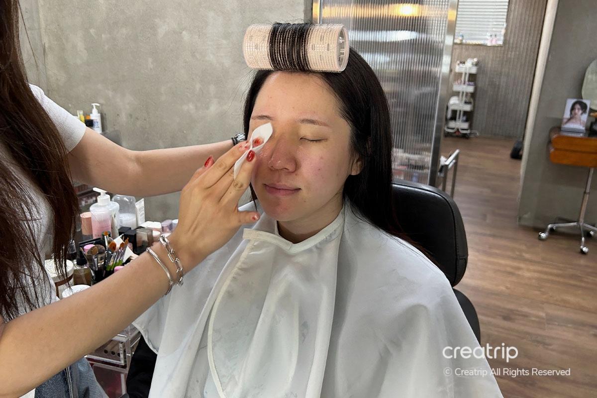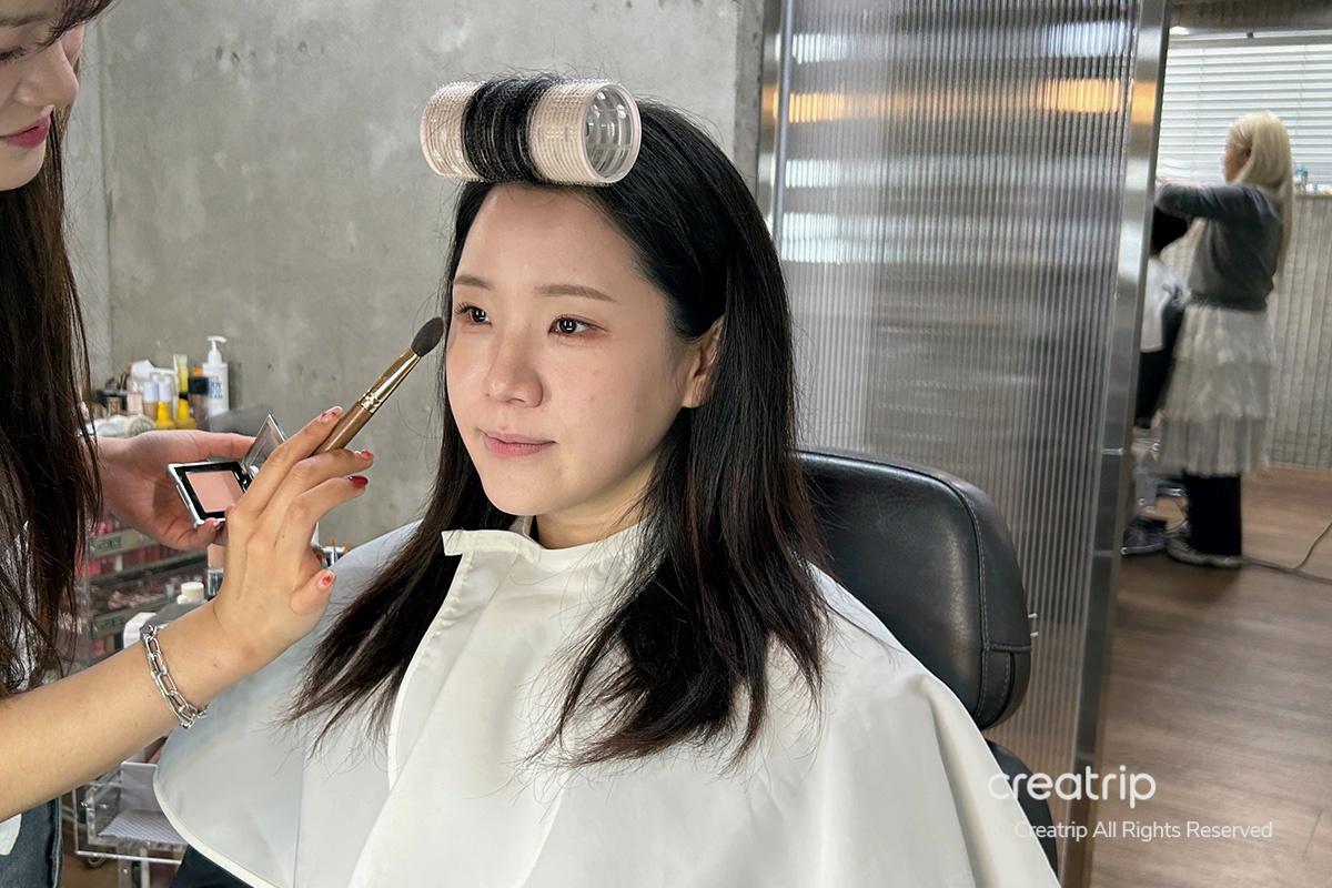 Successivamente, ha applicato la protezione solare. La maggior parte degli ospiti stranieri deve truccarsi e godersi il viaggio all'aperto, quindi ha detto che la protezione solare è un must. Per riferimento, consiglio di visitare la mattina per ricevere una perfetta acconciatura prima di iniziare il viaggio e goderselo tutto il giorno!