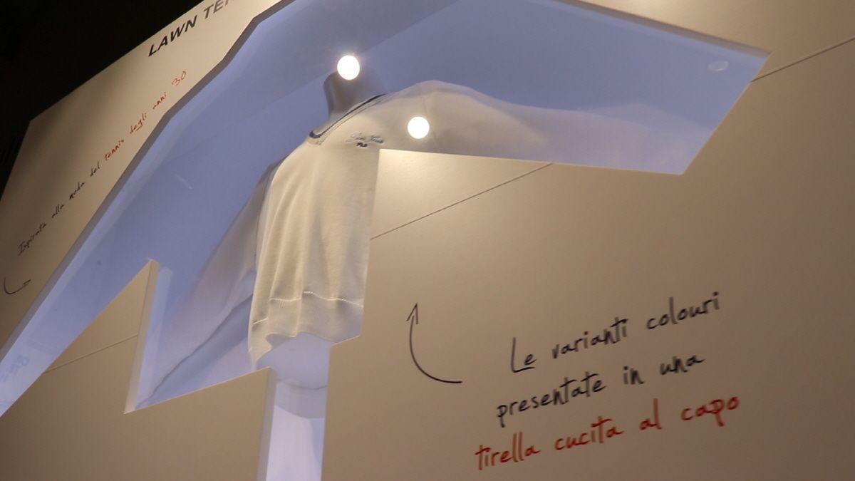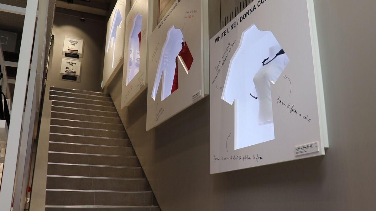 La parete sul lato della scala espone abbigliamento e scarpe che sono stati presentati nel museo FILA a Biella, emanando un'atmosfera che si può percepire solo nel negozio FILA di Seoul.