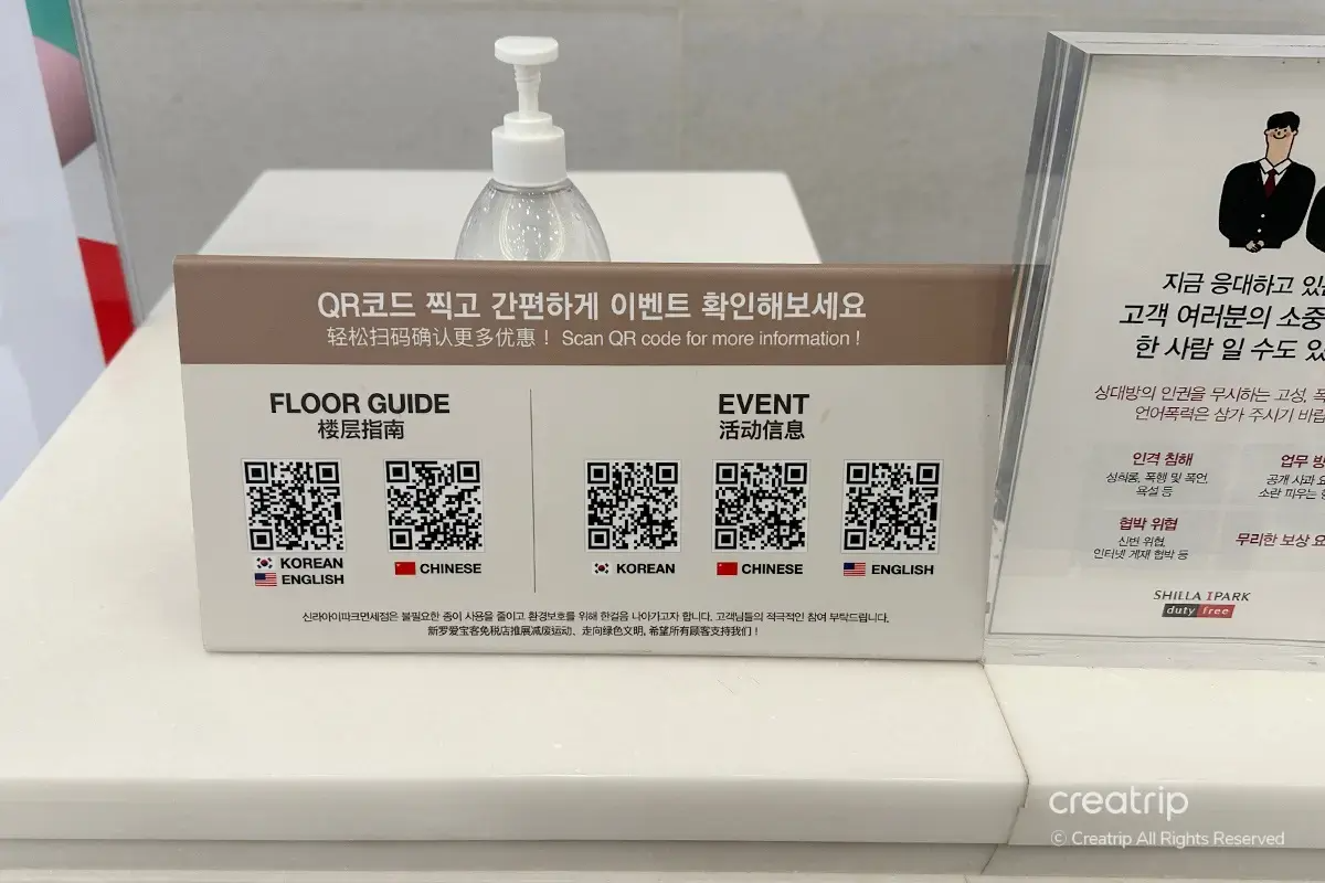 3階へ向かうと入口右側に案内デスクがあり、QRコードからフロアガイド(英語/中国語)を見ることができます。ちなみに、特典の発行窓口は5階です。