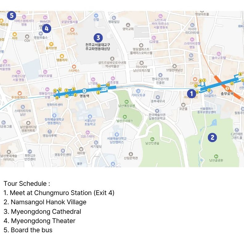 - 13:00 忠武路駅4番出口→ 南山韓屋村 / 明洞聖堂 / 明洞芸術劇場 → バス移動→ THE SHOW観覧