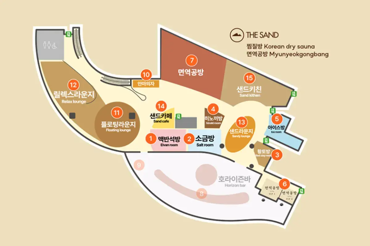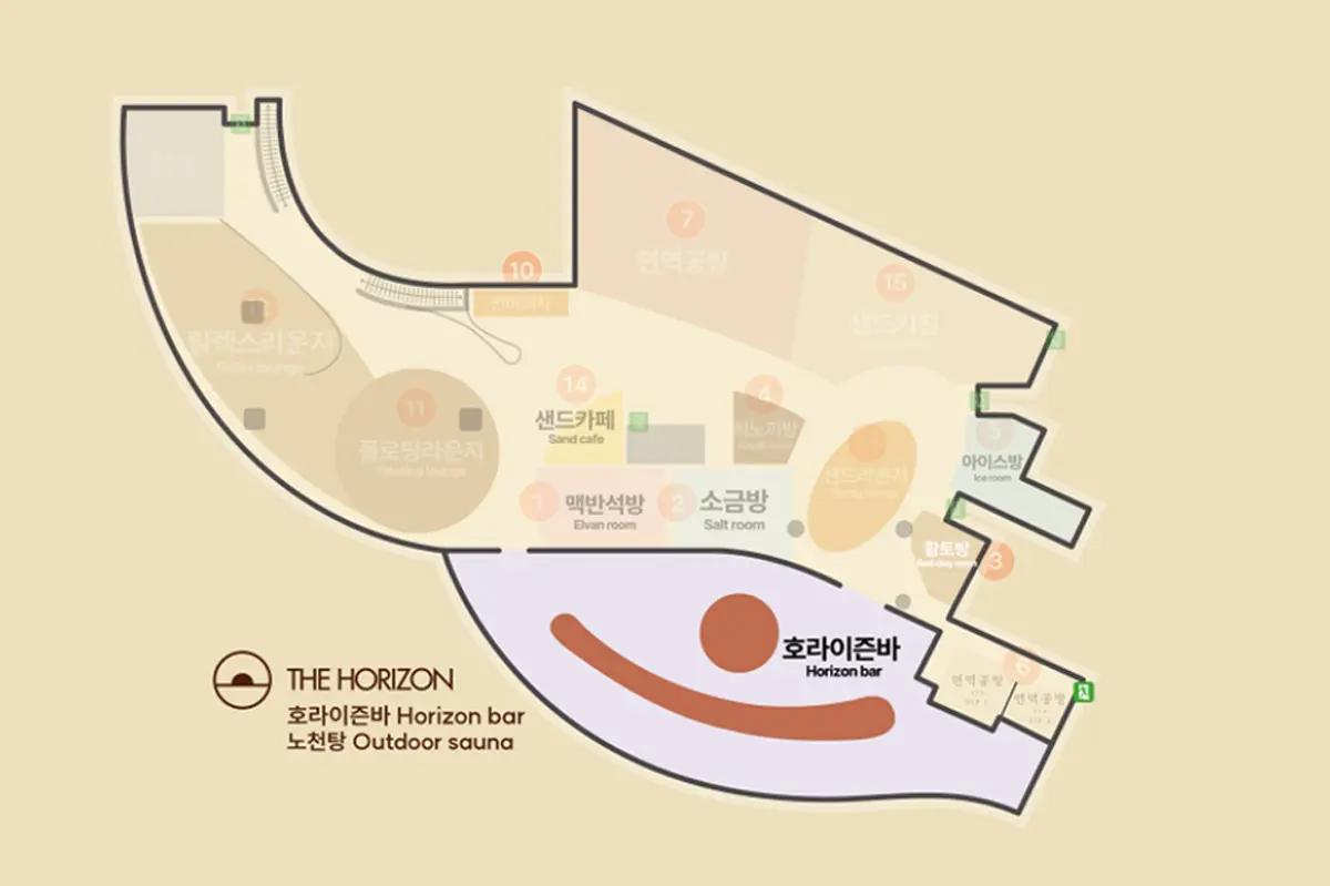 5つのテーマサウナ(塩、ヒノキ、赤土、玄武岩、氷)で心身を癒してください。免疫ワークショップ(波動療法)で日頃の疲れをほぐしましょう。