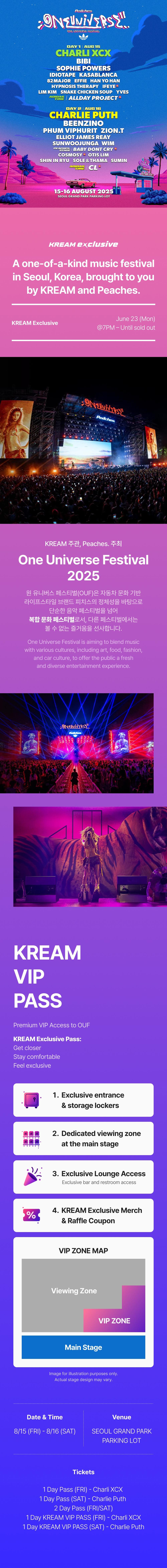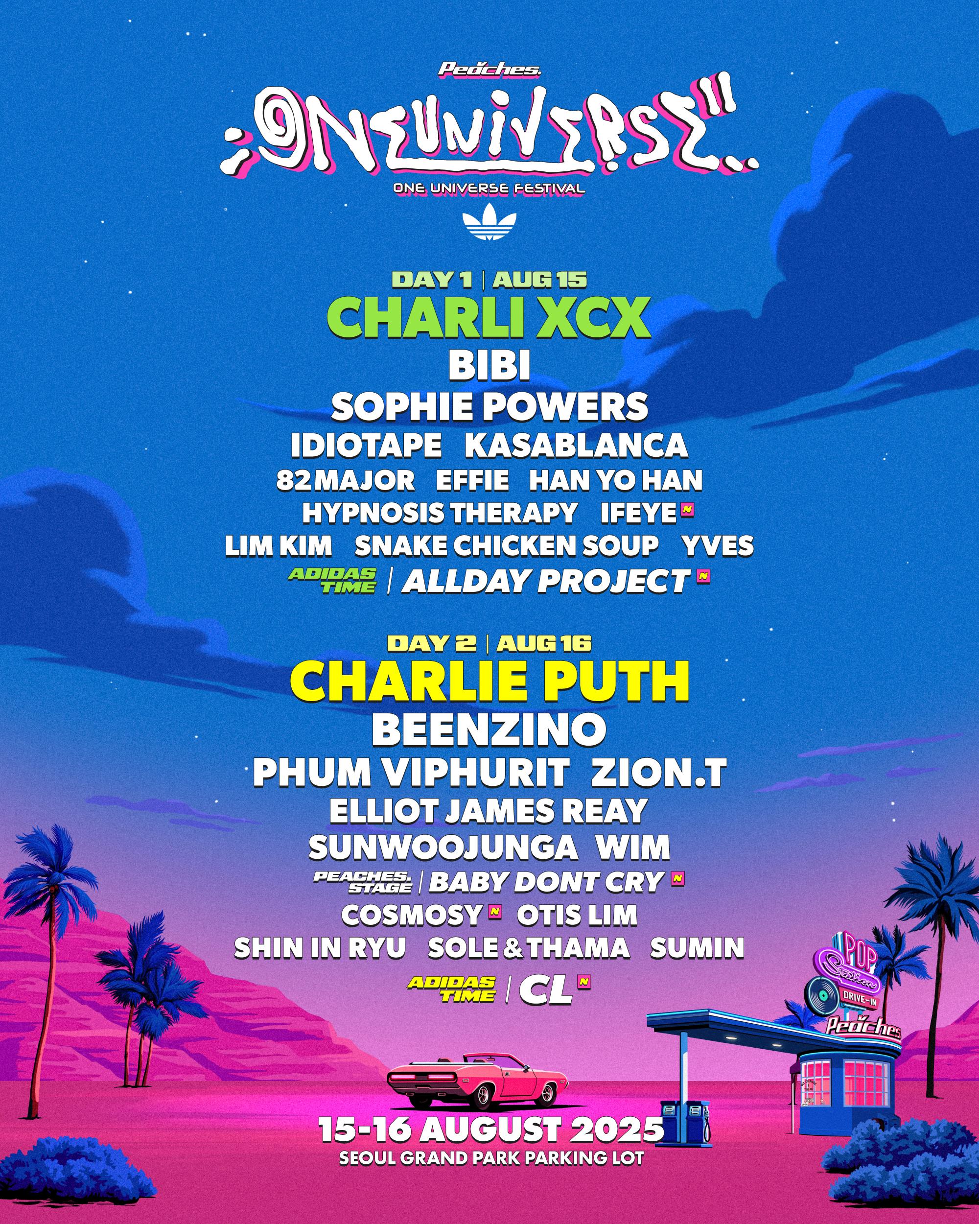 💚 おすすめポイント真夏を熱く盛り上げる超大型ミュージックフェスティバル!POP、K-POP、HIP-HOPなど様々なジャンルのグローバルアーティストが集う歴代級ラインナップ!チャーリー・プース、チャーリー・XCX、CL率いる世界的スターたちと旅立つ音楽旅行!グラミー賞受賞者から次世代スーパールーキーまで、特別なステージをお見逃しなく🔥ソウルの人気料理を味わえるF&B、芸術・自動車・ファッション・音楽が調和した多彩なカルチャーゾーンまで、ここでしか体験できないアクティビティも豊富!Your browser does not support HTML5 video.[ONE UNIVERSE FESTIVAL 2025 in ソウル]日程:2025年8月15日(金)~8月16日(土)公演時間:540分公演時間は公演計画および事情によって変動する場合があります。場所:ソウル大公園 駐車場広場出演者:Day1 (8/15):Charli XCX、BIBI、Sophie Powers、IDIOTAPE、Kasablanca、82MAJOR、Effie、ハン・ヨハン、HYPNOSIS THERAPY、LIM KIM、Snake Chicken Soup、Yves、IFEYEADIDAS TIME : ALLDAY PROJECTDay2 (8/16):Charlie Puth、Beenzino、Phum Viphurit、Zion.T、Elliot James Reay、ソヌジョンア、WIM、Otis Lim、Shin In Ryu、SOLE&THAMA、スミン、COSMOSYPEACHES STAGE : Baby DONT CryADIDAS TIME : CL