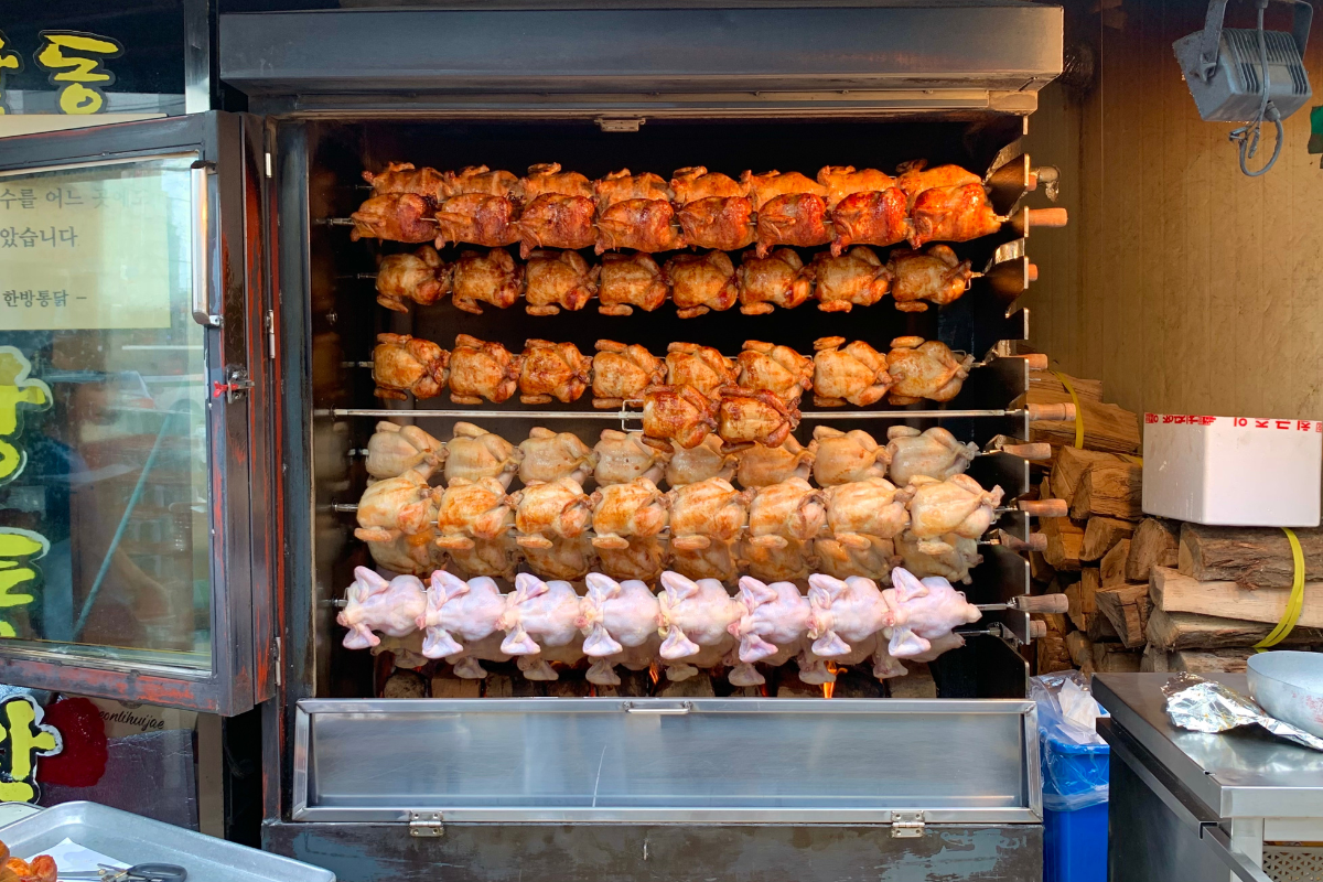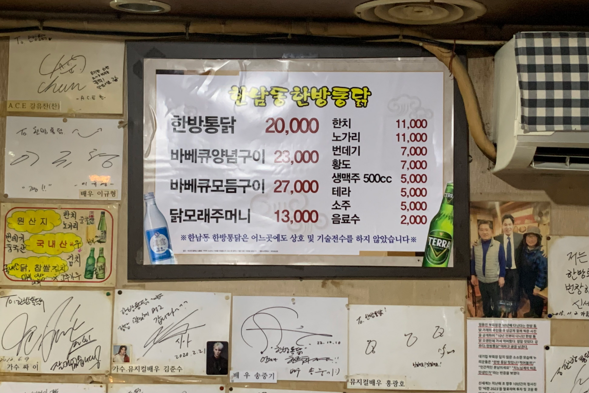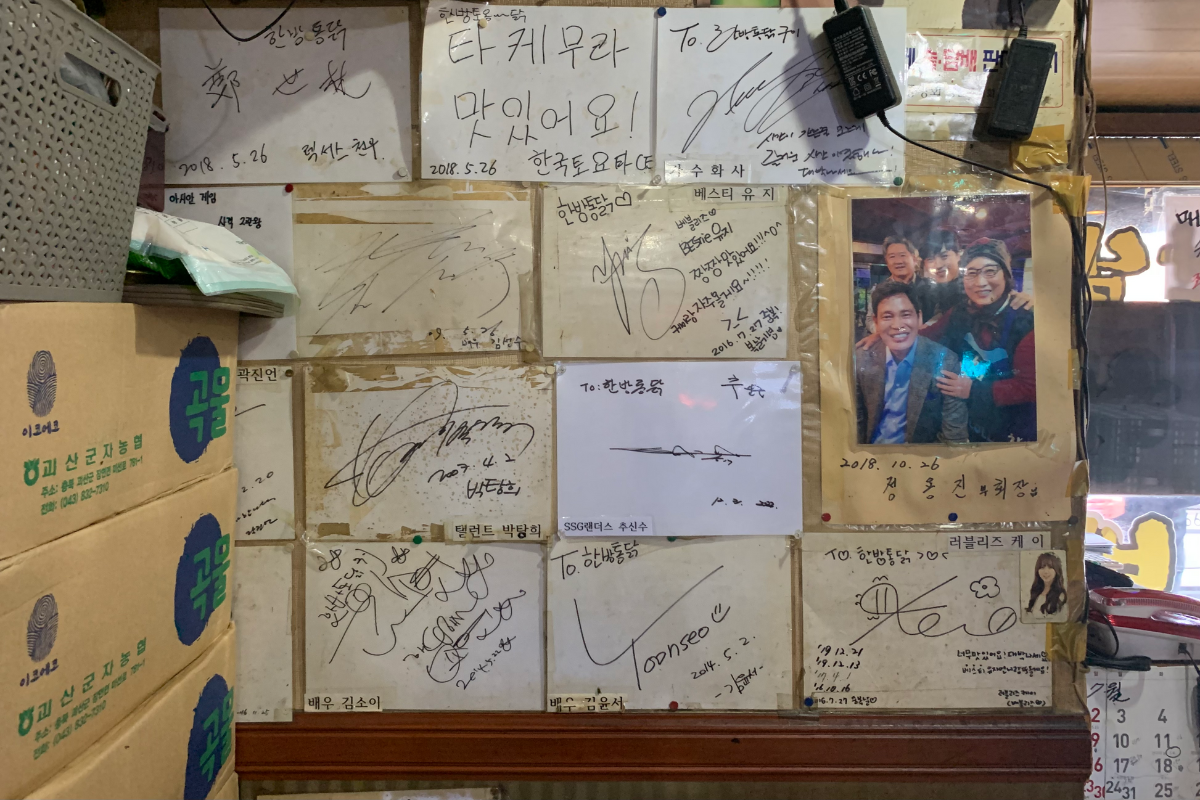 Это известное место для жареного курицы (20,000 вон), которое часто посещают знаменитости. В отличие от обычной жареной курицы, она готовится на углях и содержит меньше масла, имея нежную текстуру.