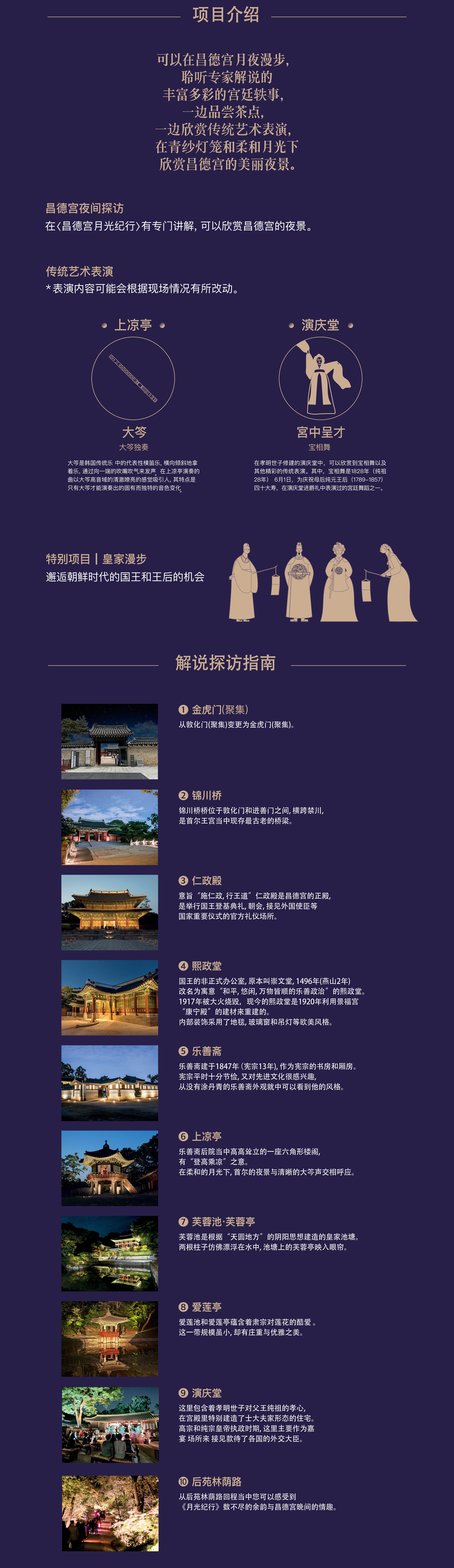 2025年秋季,昌德宮《月光紀行(月光之旅)》獨家在Creatrip販售,想要體驗古宮文化饗宴的你,千萬別錯過這個好機會。提供多種語言的專業解說、美麗的夜景拍照景點、體驗傳統表演,讓各位盡情體驗韓國文化。夜遊昌德宮,漫步後苑芙蓉池畔,看池中倒影如畫;在上樑亭聽傳統表演,還能品嘗宮廷茶點與飲品,感受夜色中宮殿的靜謐與風雅。 傳統甜點介紹五味子茶(冰)穀物茶(熱)傳統甜點欣賞表演同時可享用茶點(茶類2選1)昌德宮夜晚展現出與白天截然不同的魅力