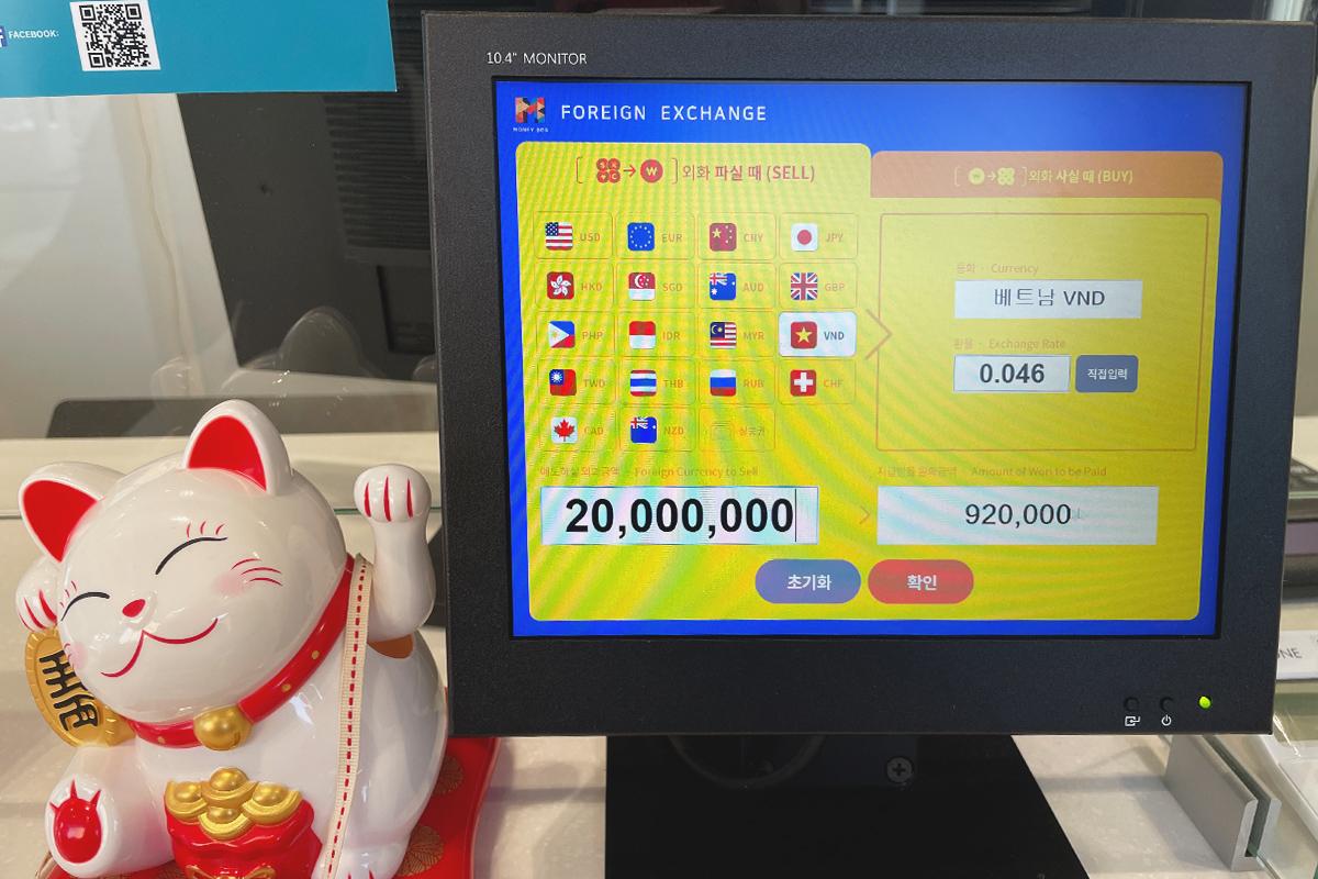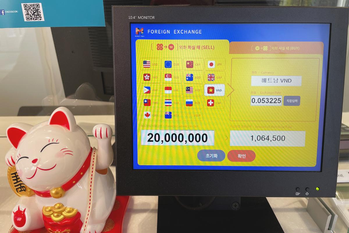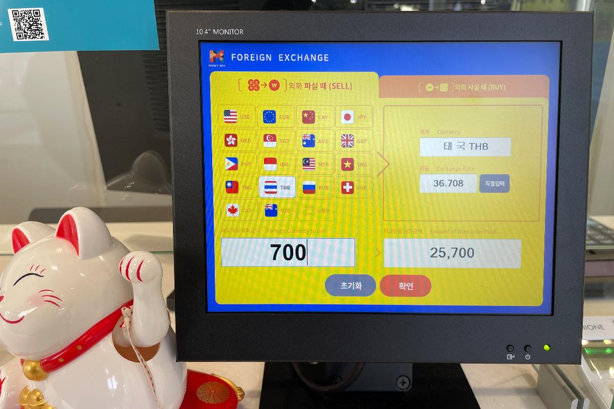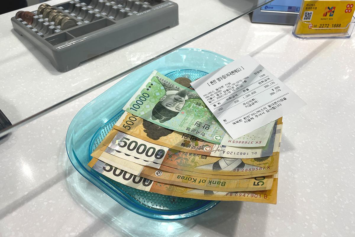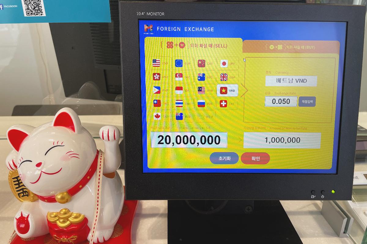 Nếu bạn đưa số tiền cần đổi cho nhân viên, thì trên màn hình sẽ hiện số tiền cần đổi, tỷ giá và số tiền won bạn sẽ nhận được. Bạn có thể kiểm tra thông tin trên màn hình trước khi nhận tiền đổi để tránh nhầm lẫn.