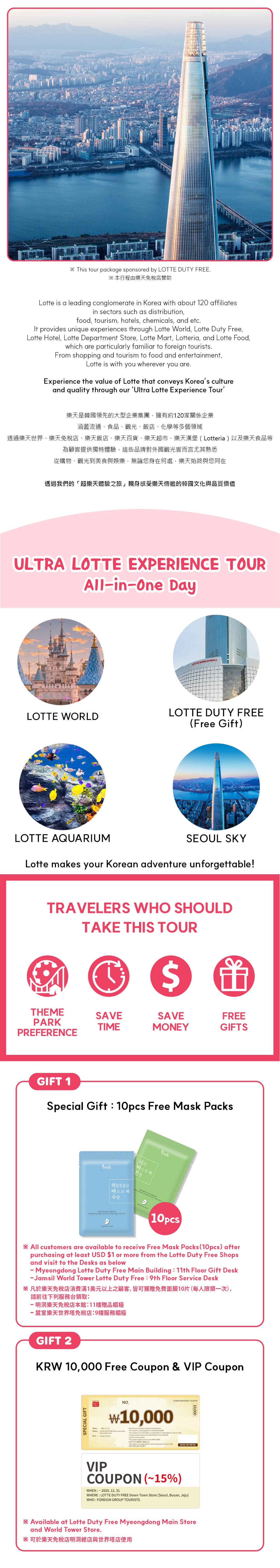 到樂天免稅店體驗特惠,包括KRW10000禮券、VIP優惠券和10只免費口罩。