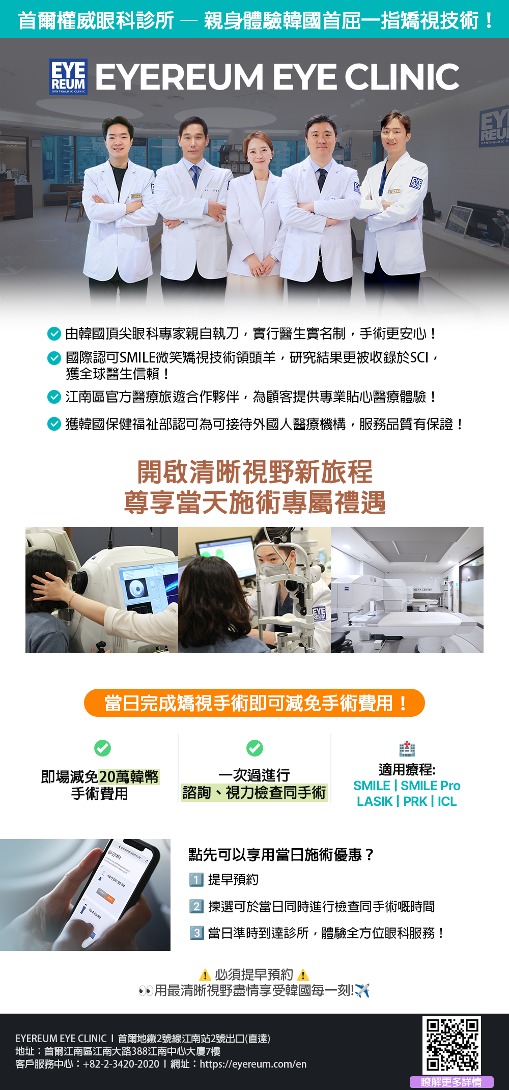 👍🏻EYEREUM眼科係韓國最早引入SMILE Pro技術嘅眼科診所,首席院長Dr. David Sung Yong Kang更加係ZEISS蔡司國際顧問委員,國際聲譽極高!