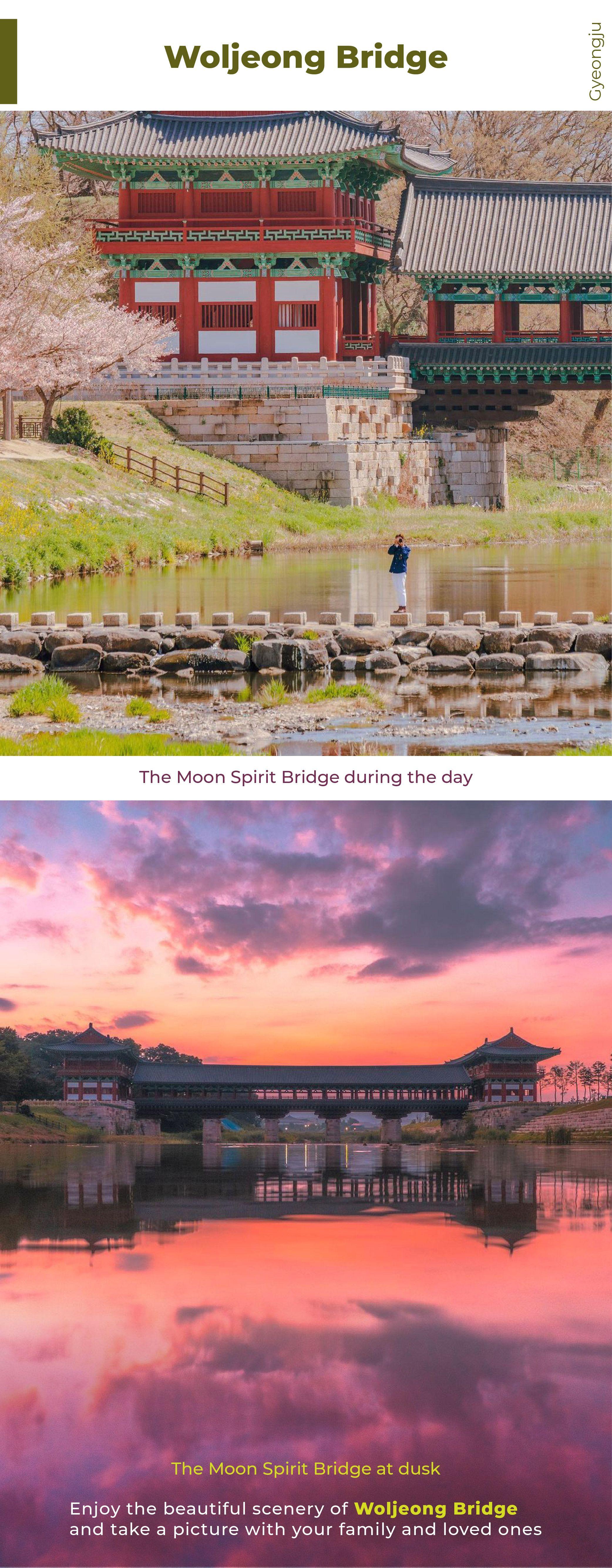 月精橋係新羅時代木橋嘅美麗復原建築,特別係夜晚點燈後氣氛夢幻,亦係人氣打卡熱點。