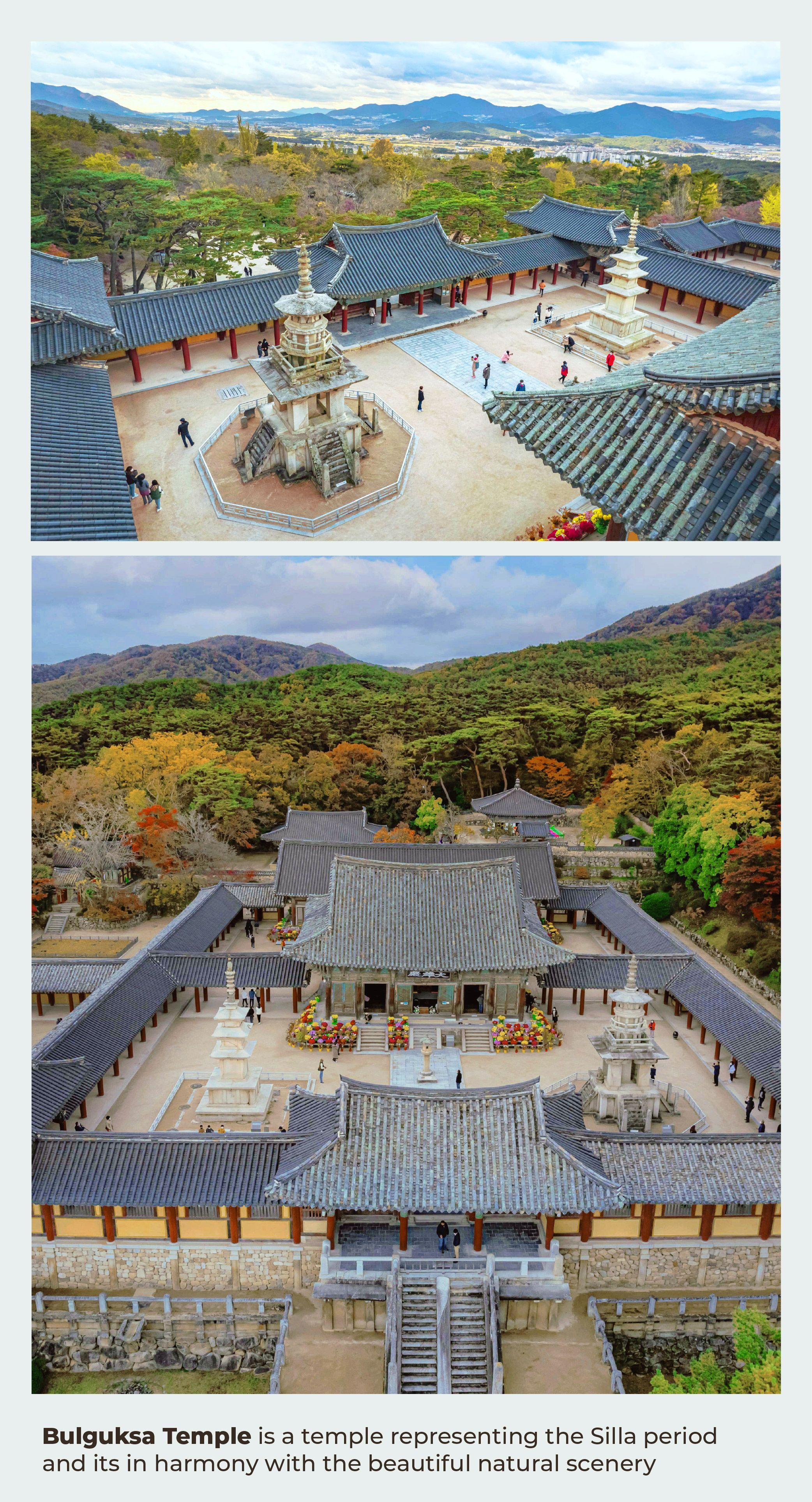 被列為聯合國教科文組織世界文化遺產嘅佛國寺,係新羅時代代表古代佛教文化嘅寺廟,以精緻同優美嘅釋迦塔、 多寶塔,以及寧靜嘅寺院景色,展現新羅建築嘅傑作。