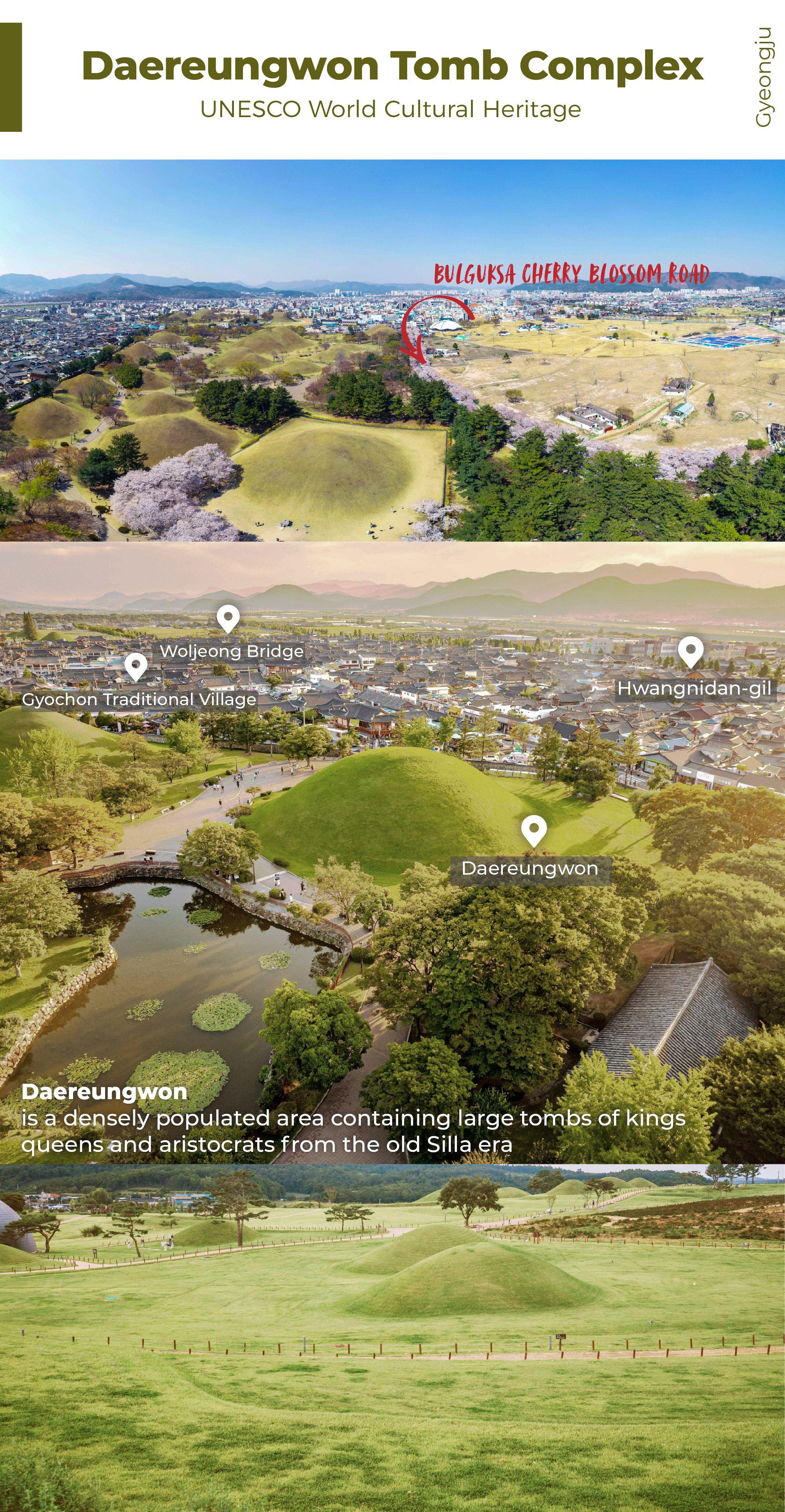 - 歷史同傳統共存嘅城市—慶州嘅代表景點,包括佛國寺、校村村、大陵苑、東宮同月池,一日內可以盡覽,係非常充實嘅一日遊行程。