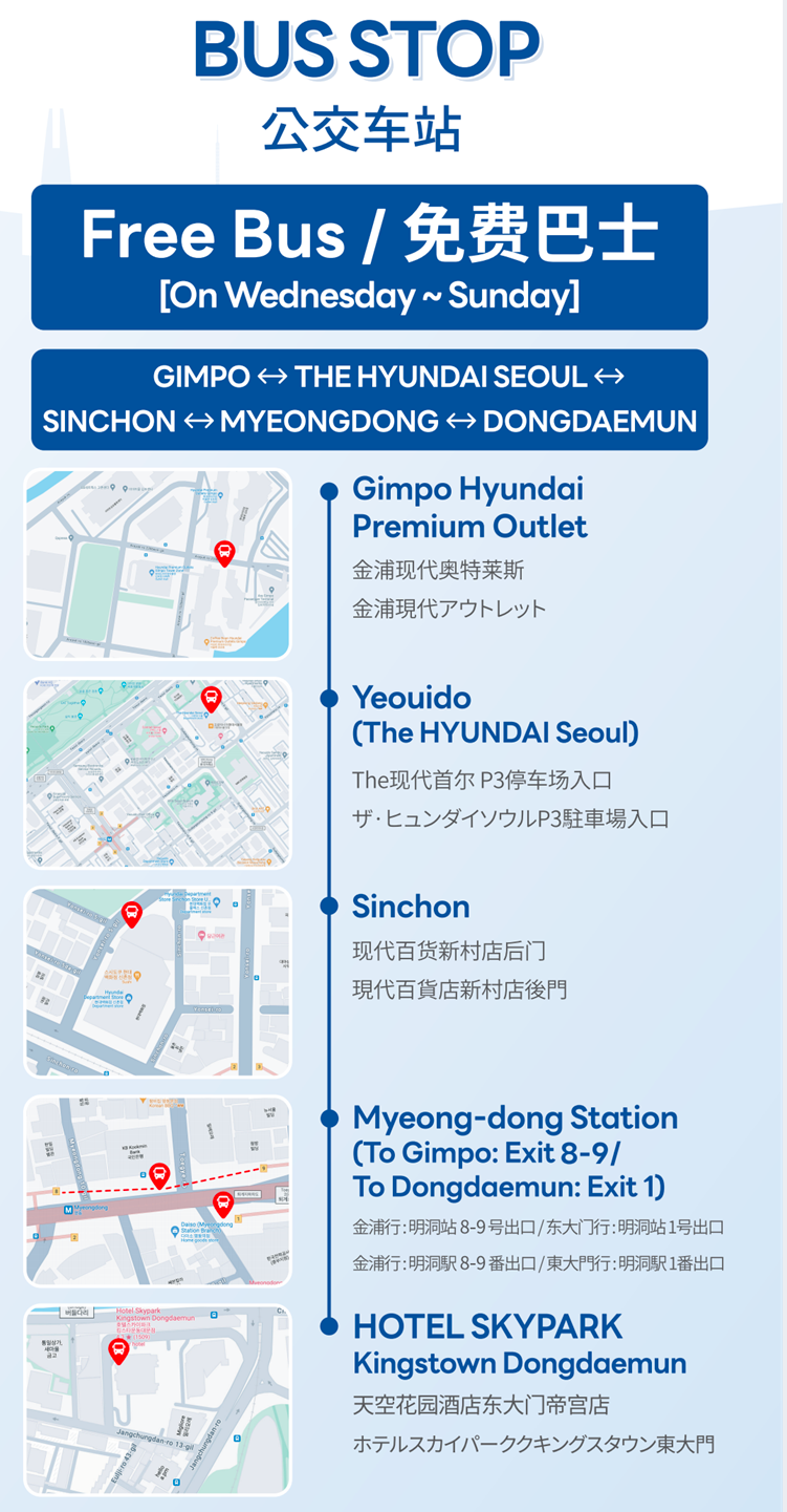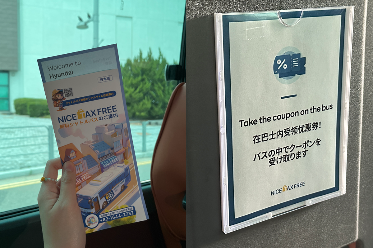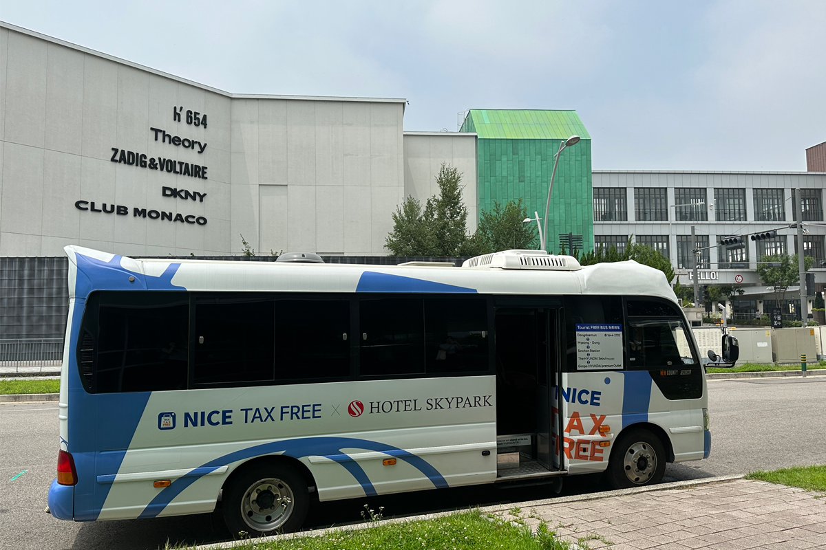 Nice Taxfree免費提供交通接駁車,從東大門、明洞、新村、汝矣島到金浦都會停靠,為了旅客方便造訪金浦現代Outlets來購物,真的超及方變。