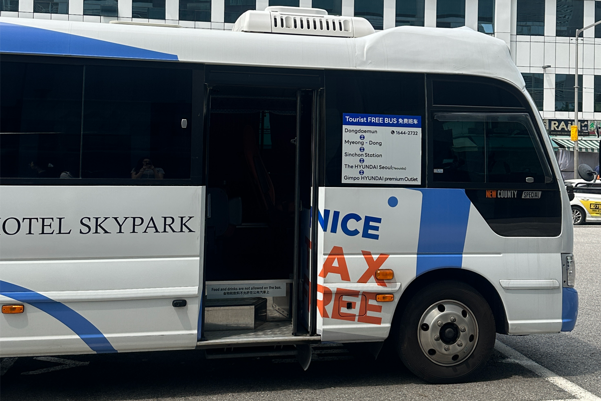 由Nice Taxfree營運的免費接駁車,從東大門出發,到明洞、新村、汝矣島到金浦現代Outlets,非常方便,乘客還能掃QR Code領取專屬優惠?趕緊收藏起來吧。